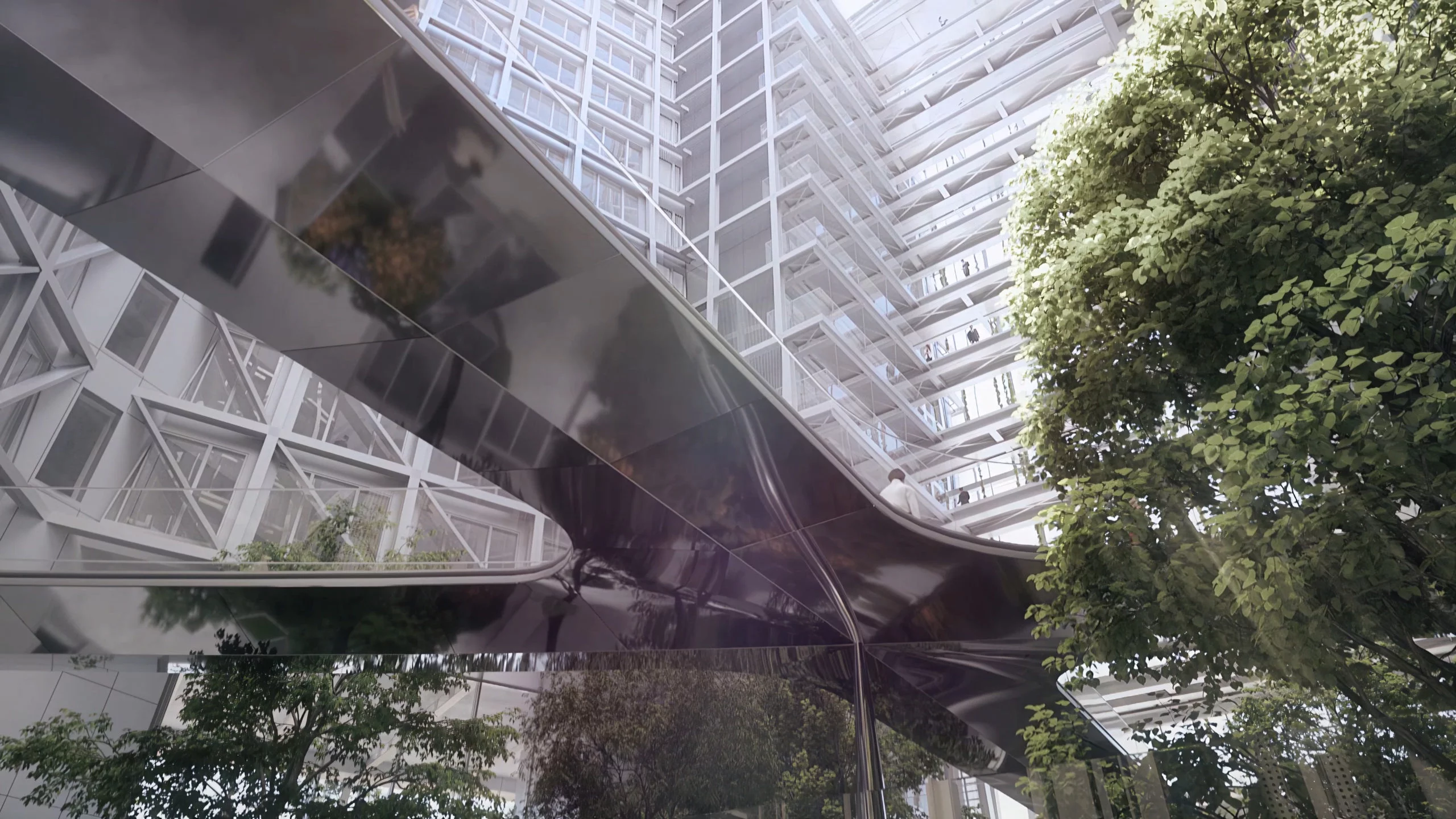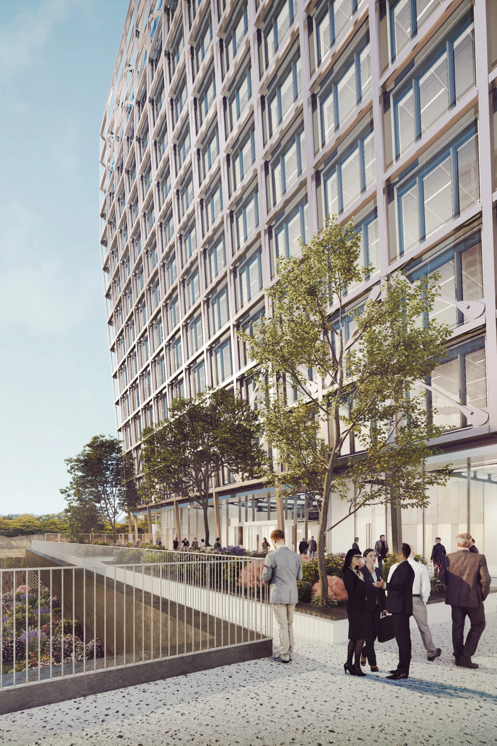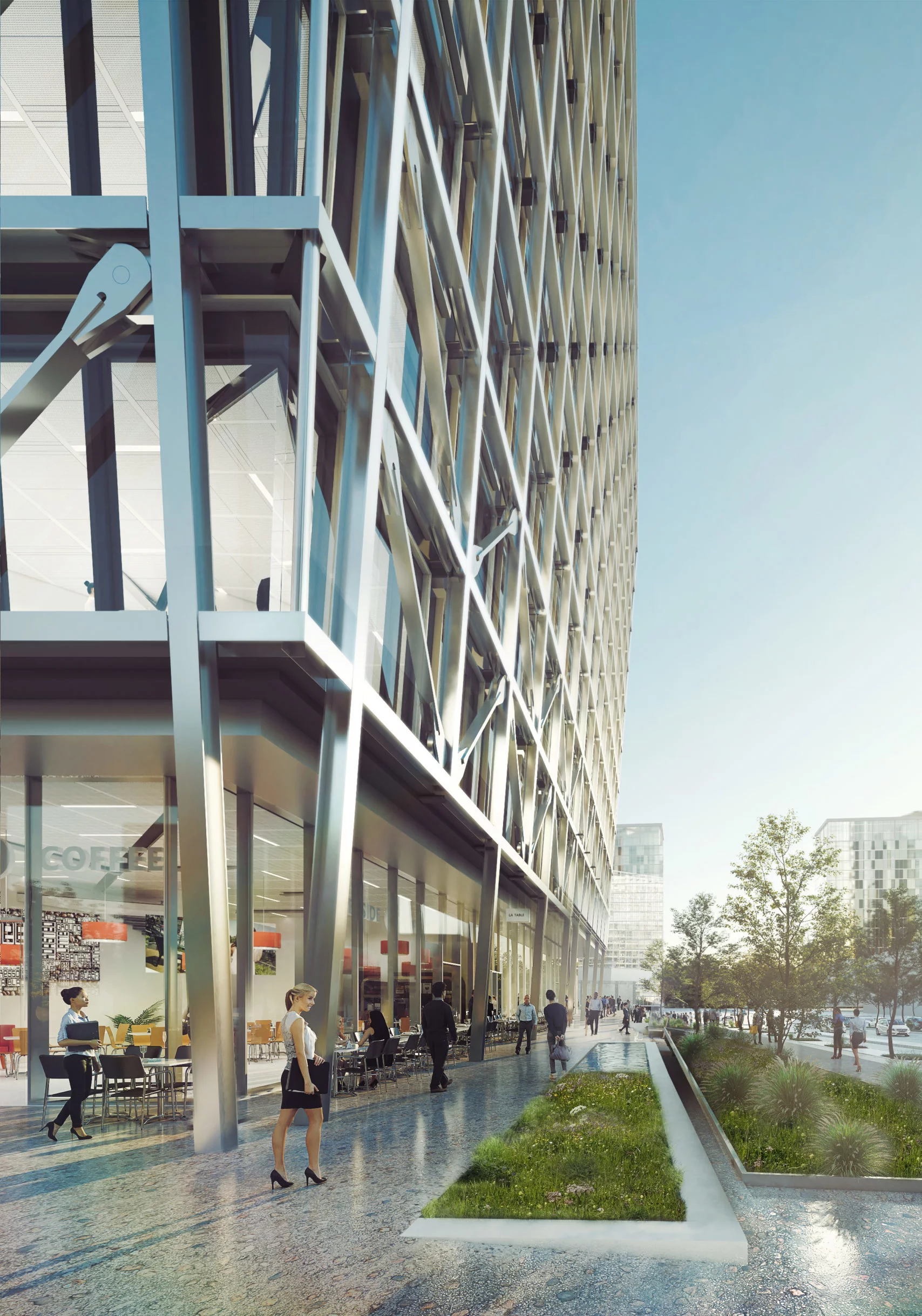 La facciata esterna è una doppia pelle con protezioni solari integrate, la facciata dell’atrio invece una facciata a cellule. Il piano terra, una facciata completamente d’acciaio e vetro.