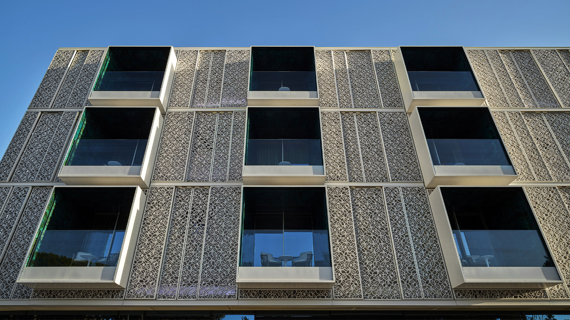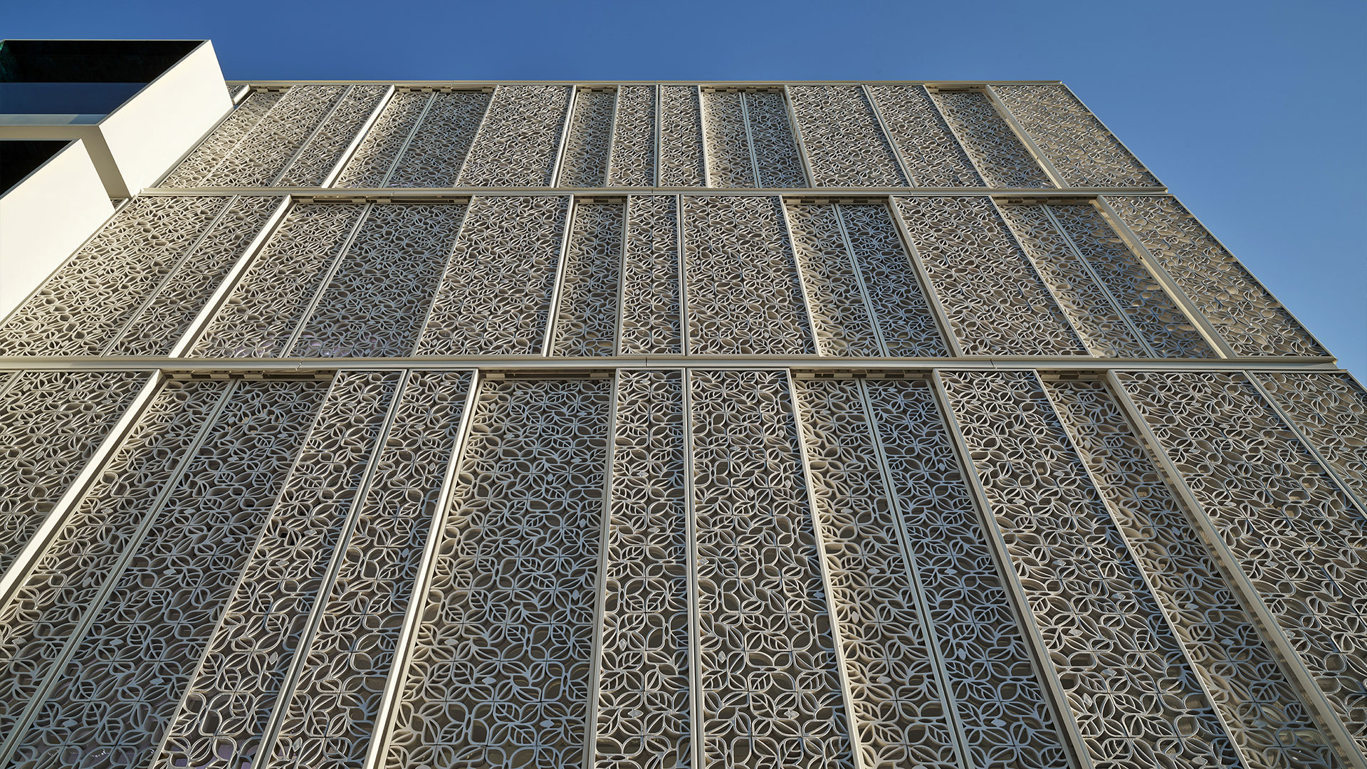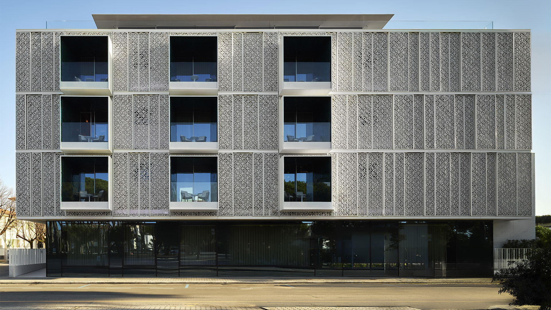 Il rivestimento di parete si connota inoltre dall’inserimento di vari moduli apribili, in corrispondenza di retrostanti terrazze, caratterizzati dall’essere motorizzati con comando remoto. Per tali elementi sono stati eseguiti adeguati cicli di apertura/chiusura, finalizzati a garantire l’efficienza nel tempo dei gruppi elettromeccanici, soprattutto in rapporto al notevole peso degli elementi mobili.
