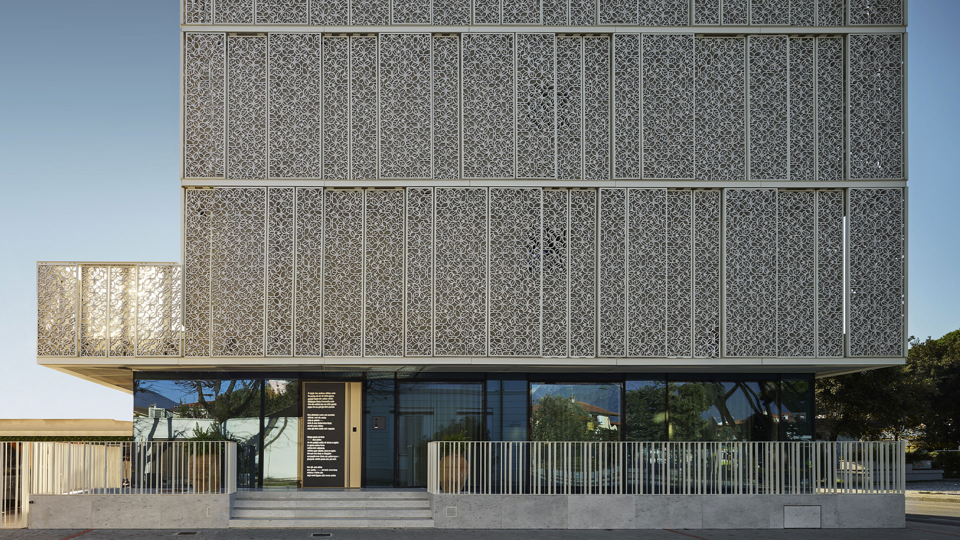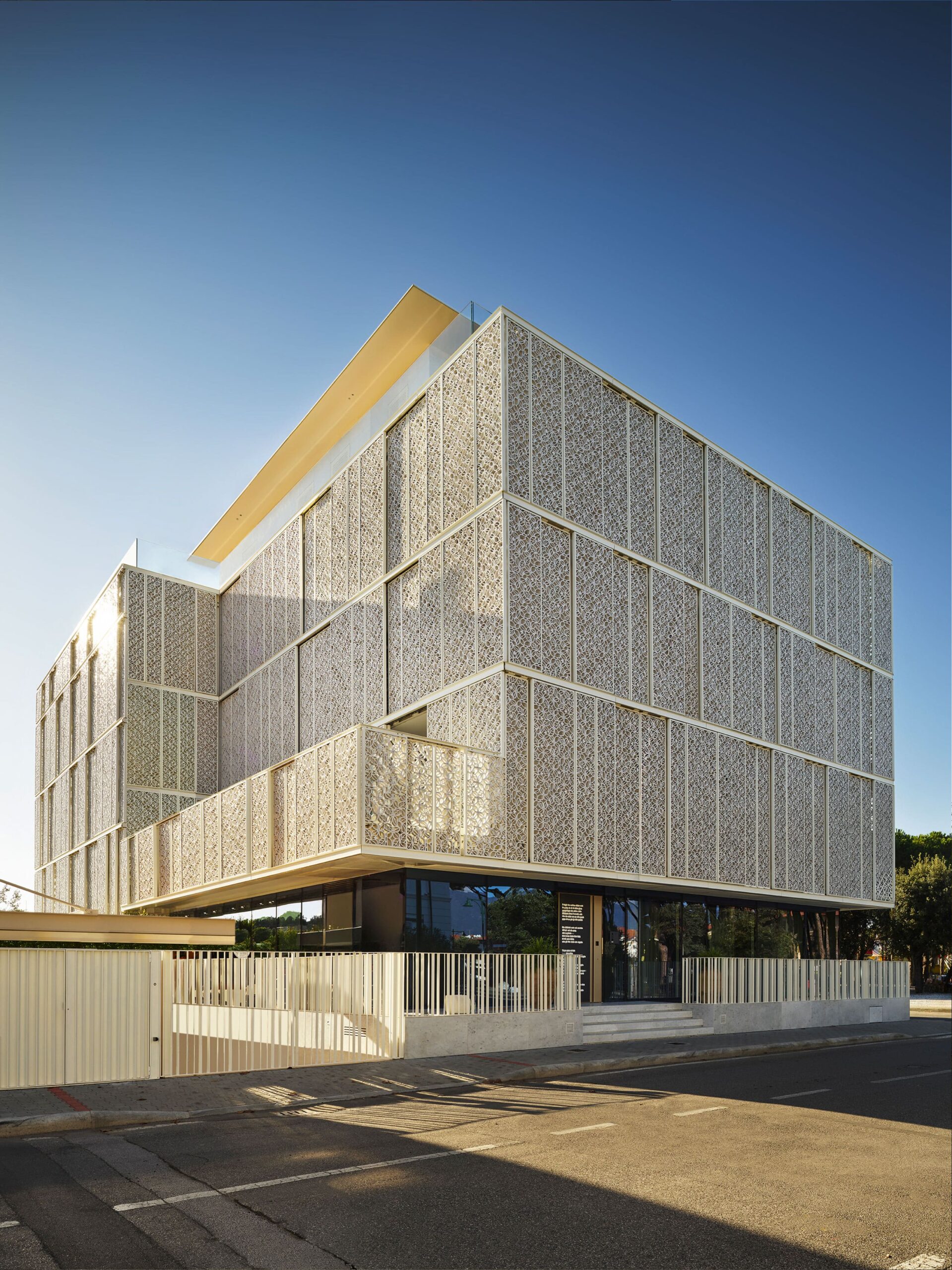 Il fabbricato si configura come una struttura semplice, la scelta architettonica è consistita nell’ideare un involucro che ne mantenesse l’aspetto volumetrico, conferendo nel contempo una forte connotazione visiva mediante l’utilizzo di mattonelle in ceramica che richiamano aspetti floreali.