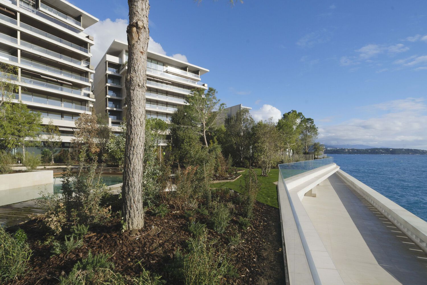 Eretti su un terrapieno artificiale e circondati da 1500 alberi ad alto fusto provenienti dai vivai della provincia di Pistoia, gli edifici di Valode & Pistre e le ville di Foster, Boeri e Ando, affacciate sul mare come le prime ville novecentesche della leggendaria French Riviera – la Côte d’Azur – beneficiano di una calma e di un contatto ravvicinato con la natura che appare impensabile per tutta l’edilizia retrostante, fatta di palazzi e torri privi di qualità architettonica di pregio, costruiti l’uno sull’altro nel corso degli ultimi decenni.
