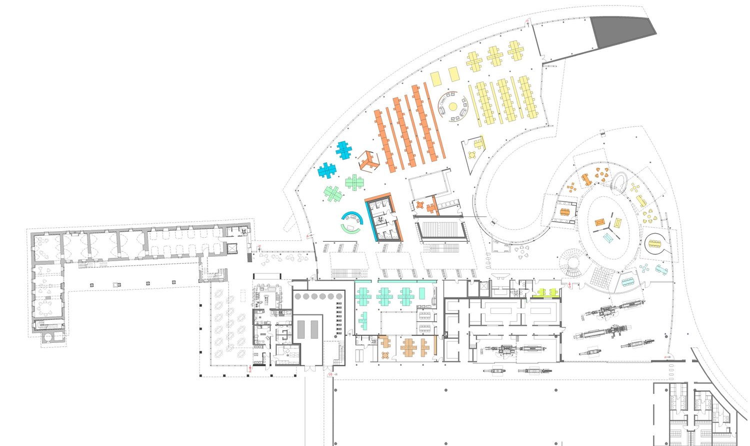 Le strutture del corpo direzionale sono per così dire intersecate da “cubotti” che costituiranno “degli uffici negli uffici”, andando a configurare una particolare connotazione all’insieme.